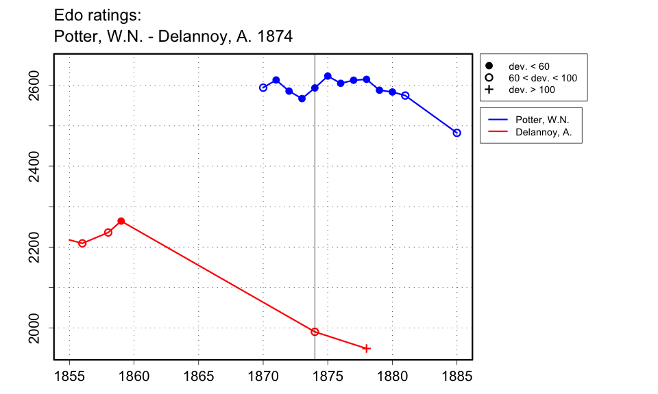 This is a soft result. We are told that Potter beat Delannoy, giving him Knight odds. It may have been a single game, or perhaps more, but a 1-0 result is representative at least. |