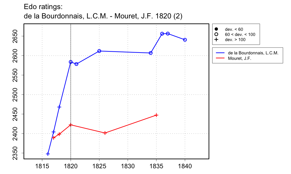 This result comes from a description by Alphonse Delannoy in the Chess Monthly of Nov. 1880 (pp.72-74), many decades after the event. The series of games was not an arranged match, but was played for financial stakes on each game. These games at odds were played after de la Bourdonnais had won a series of games played even. Those games are recorded separately here. Delannoy's description suggests that three games were played at the odds of Pawn and Two Moves, with the stakes increasing each time, from 40 francs to 80 francs to 600 francs. No date is given, but Delannoy says that it was after Mouret returned from England where he was touring as the operator of the chess automaton (the Turk). He conducted a tour of England in 1819, and was the operator of the Turk throughout 1820, and after. When exactly he returned to Paris (perhaps briefly) and played de la Bourdonnais is unclear, but it must have been at least 1819. Delannoy also says that it was before de la Bourdonnais had 'tackled' Deschapelles, so at least before the long triangular event with Cochrane in 1821. I will guess at 1820, but this may be in error by one year either way, assuming Delannoy's statements are correct. |