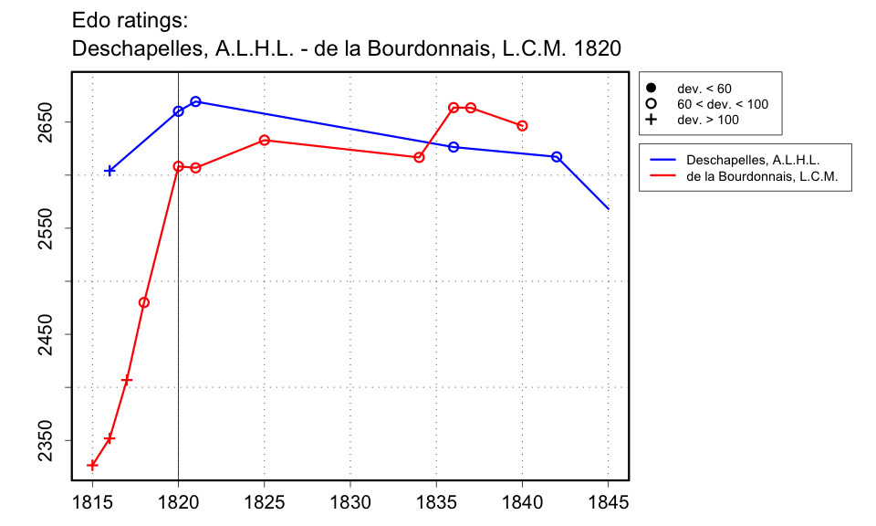 | According to Delannoy's account, de la Bourdonnais challenged Deschapelles at the Café de la Régence, they played a single game, and de la Bourdonnais lost. Afterwards, they played in private and results of those games are not known, though Delannoy suggests that Deschapelles' subsequent reluctance to play de la Bourdonnais in public indicated that de la Bourdonnais became the better player. No date is given, but this must come after de la Bourdonnais' games against Mouret, also recounted by Delannoy, and those occurred after Mouret had been touring England as the operator of the automaton, which he started doing in 1819. It must also come before the triangular contest between de la Bourdonnais, Cochrane, and Deschapelles in April 1821. I therefore guess at 1820. |