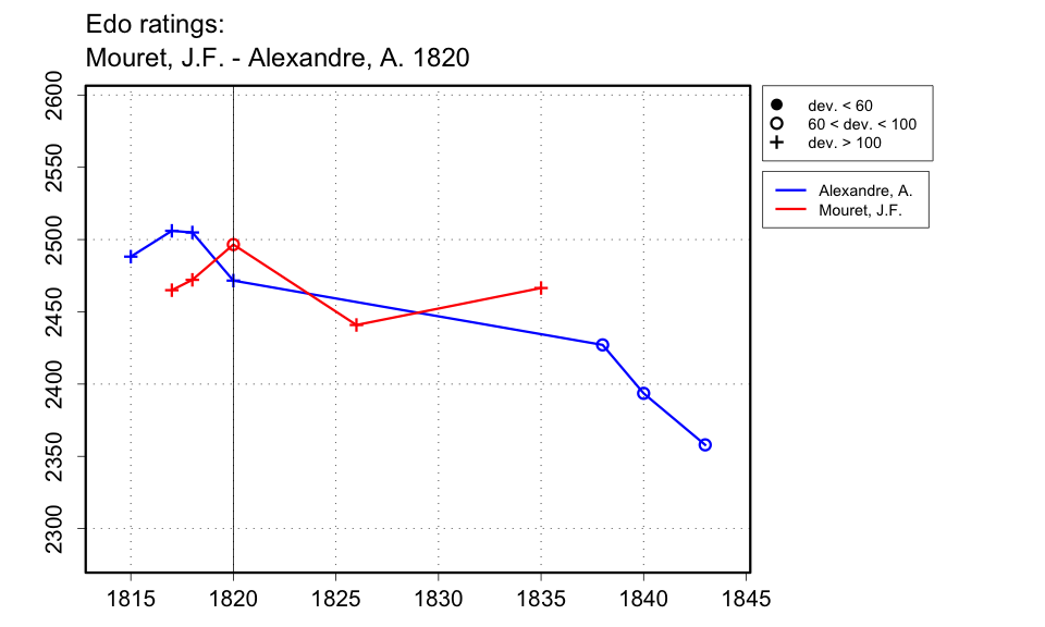 | This is a soft result. According to Delannoy, at the time of de la Bourdonnais' challenge to Mouret, which I take to be about 1820 since Mouret had just returned from a tour of England as operator of the automaton, Mouret had been considered the best player in Paris after Deschapelles, and de la Bourdonnais had been playing even (not receiving a handicap) with Alexandre and Boncourt (the other players Delannoy mentions here are perhaps from a later period). Thus, Mouret was considered better than those two players. I use a soft result of +1-0=1 to indicate this. |