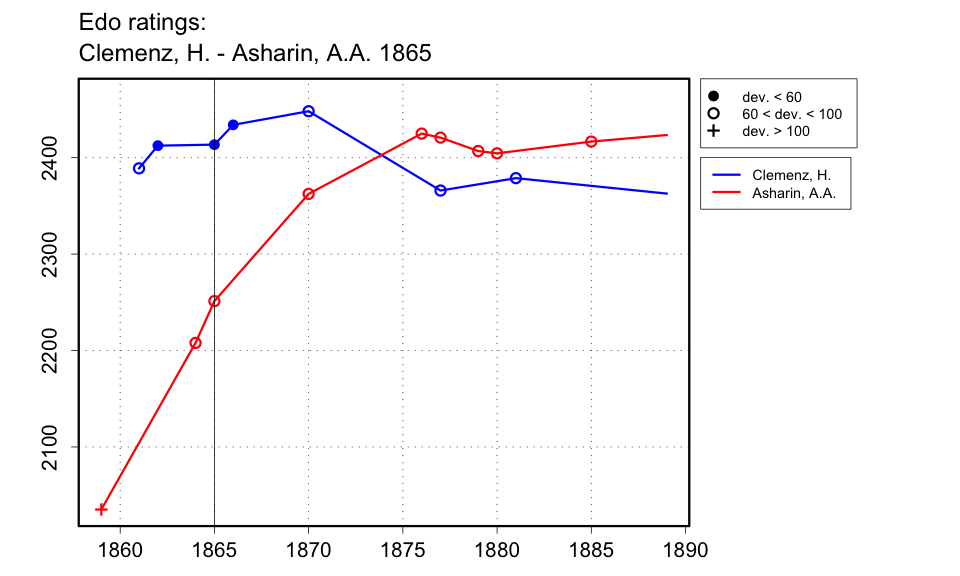 | The Baltische Schachblätter of 1889 (p.23) says that a combined score of four matches that took place in 1865 and 1870 was +28-11=10 (number of draws approximate), for Clemenz. I will split these into results of +14-5=5 in 1865 and +14-6=5 in 1870. The actual scores in each year may be different, but the total is as reported. |