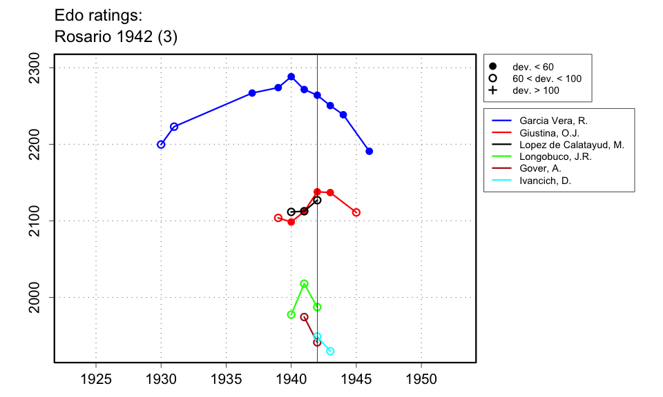 Only partial results available. Three other players, Rodolfo Parody, Jorge Campanella, and Rómulo Gozzi, were eliminated after the first round and did not play the second round with the six players listed here. The numbers of wins, draws, and losses given for Giustina (+7-3=1) and Ivancich (+1-4=9) do not total the right number of games (13), so I am guessing that the numbers of wins and draws are correct (so their totals are correct) but the number of losses should be 5 and 3, respectively. Results are reported in Oct. 1942, so I am guessing that the tournament finished in Sep. 1942. |