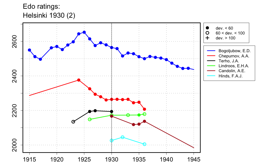 The scores given add to 15.5, instead of 15 as they should for a 6-player single-round all-play-all tournament. I am guessing that the sixth player, Hinds, scored 1 point, not 1.5 as given, since the score 1.5 is given for both Terho and Hinds separately, instead of jointly, as is done for Lindroos and Chepurnov, who both scored 2.5. |