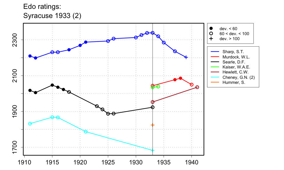 | The Buffalo Courier Express of 27 Aug. 1933 (p.10) gives a total score for Cheney of 1.5 points, but lists his results as +0-5=1, which should be 0.5 points. |