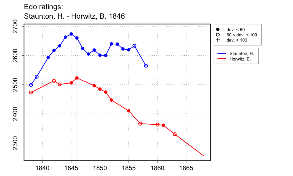 | Potter's obituary of Staunton (City of London Chess Magazine, Aug. 1874, p.166, also reproduced at Sarah's Chess Journal website) gives the result as +11-7=3; all other sources give +14-7=3. Giffen gives dates as Feb.-June 1846; Di Felice gives Mar.-Apr. The Chess Player's Chronicle gives the start date explicitly as 2 Feb. 1846 and the concluding report is in the June issue, but Staunton's column in the Illustrated London News of 2 May 1846 gives the final result, as does the Apr. 1846 issue of Le Palamède, so I presume it finished in April. |