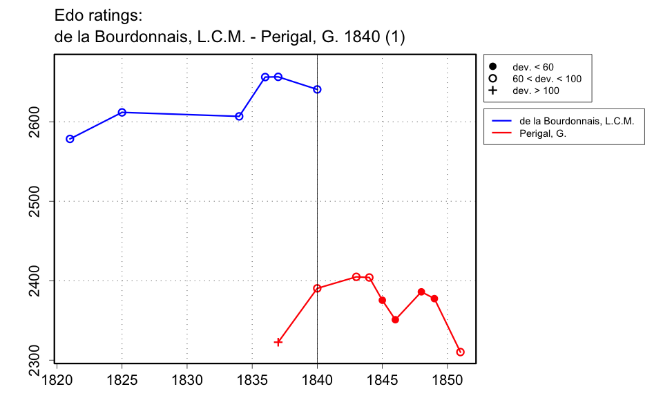 | Walker only says in Bell's Life in London (14 Feb. 1841, p.1) that de la Bourdonnais' opponent was 'Mr P., the Sec. of the London Club', but in the 13 Dec. 1840 issue, a list of subscriptions for a fund for de la Bourdonnais includes 'Mr. Perigal (Secretary of the London Chess Club)'. Bell's Life in London (29 Nov. 1840, p.4) says de la Bourdonnais played 'one of our very finest players', giving Pawn and two Moves and won both, 'on Wednesday', presumably 25 Nov. 1840. It is likely that this refers to his first two games against Perigal, from the later references to those games. |