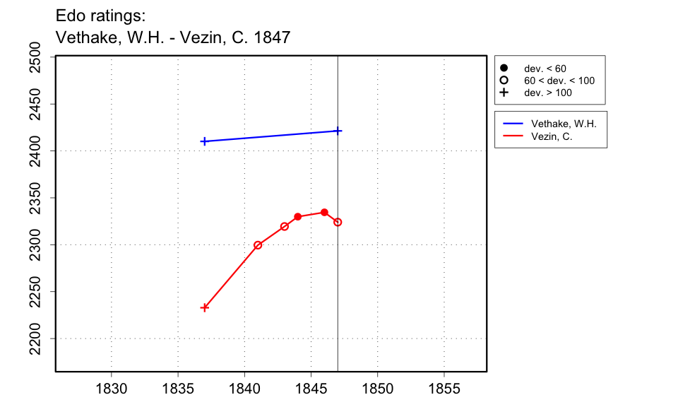 | Allen (in Fiske) does not give the year, but this was their last match and they 'continued to play... until Mr. Vezin began to feel the approaches of the slow decay of which he died', which would be about 1847 (p.357), though he died in 1853. |