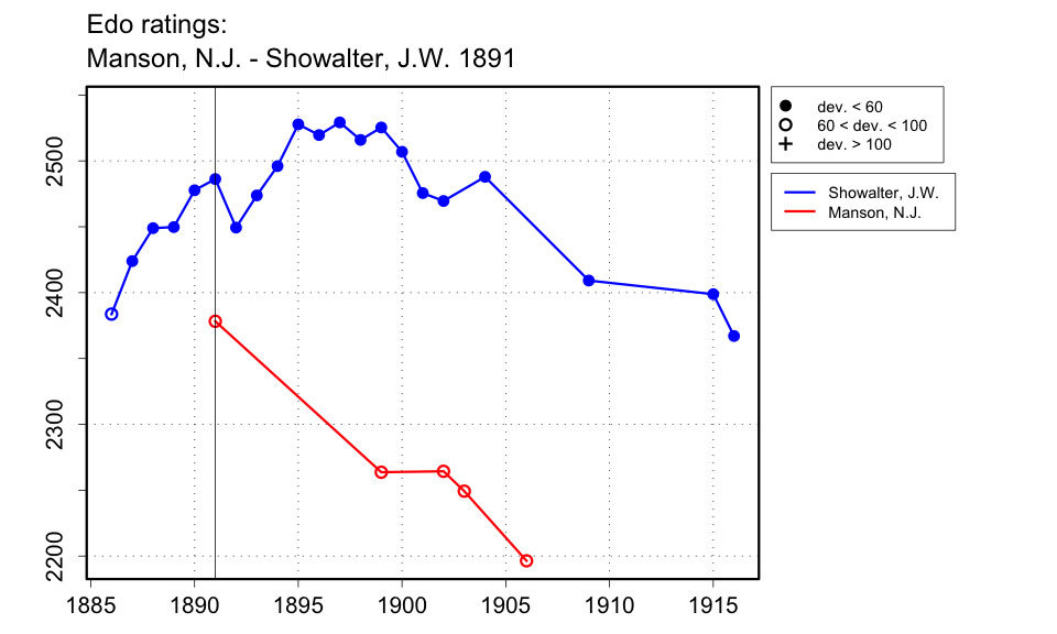 | The San Francisco Chronicle of 18 Nov. 1893 (p.11) dates this to 1890, but the information from the San Fransico Morning Call given in the Mechanics Chess Room Newsletter (see web site) suggests that Showalter's first visit to California was in 1891. |