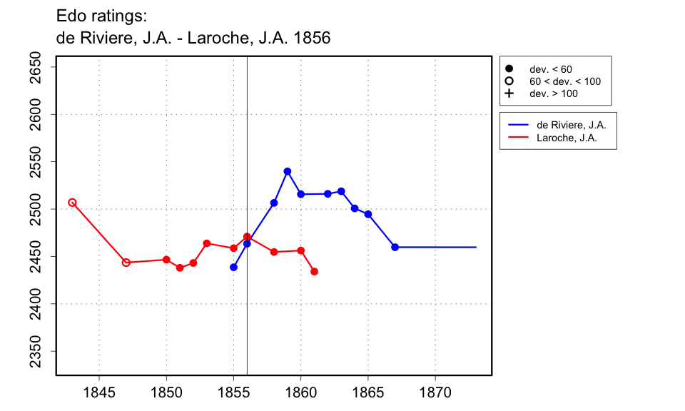 | Combined result of two matches? Staunton, in the Illustrated London News of 19 Apr. 1856 (p.411) says that Laroche had arrived in Paris and there was talk of a match with de Rivière. In the 7 June 1855 issue (p.643) he says that a new match started 'a few days back'. In the 28 June 1856 issue (p.715) he gives the final result of the two matches, +19-15=1 for Laroche. However, the 15 May 1856 issue of La Régence says that Laroche had been in Paris for a month and that the result of their 35 games, all played in the month of April, was +19-15=1 for Laroche. So if there was another match that started late in May or in June, it is not included in this score. Spinrad gives +3-2 for de Rivière but cites the Oxford Encyclopaedia of Chess Games, and so this is probably just the result for a few preserved games. Di Felice also gives +3-2 for de Rivière, probably from the same source, though this is not indicated. |