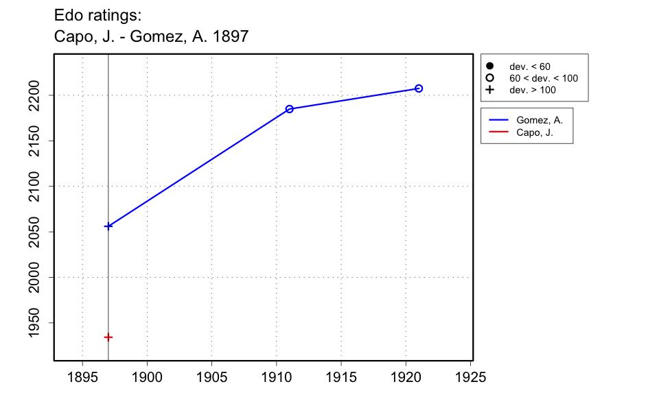 | The Sep.-Oct. 1897 issue of Ruy López (p.159) says that Gomez and Capo played two matches, each for three games, one match won by each, but without exact scores. I am using a soft result of 1-1 as reasonably representative for rating purposes. |