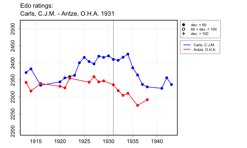 | Feenstra Kuiper gives the result as +8-4=11 for Antze. Di Felice and Keller give +8-4=11 for Carls. Feenstra Kuiper and Di Felice date the match to 1931, but Keller gives the exact end date and indicates that it started in 1930. The 7th game was played on 7 May 1930, so the match started before that. |