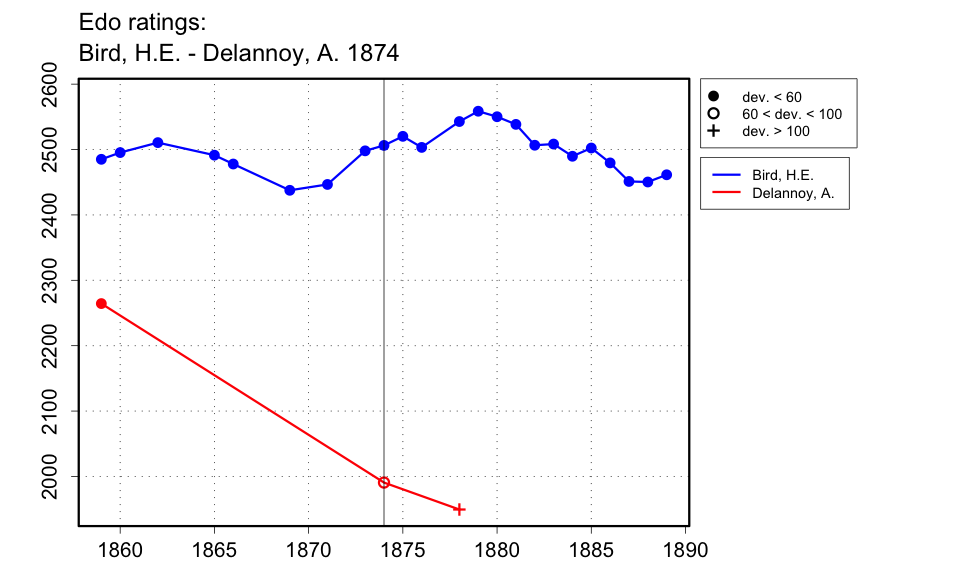 This is a soft result. We are told that Delannoy won only the first of several games against Bird, who gave him Knight odds, but Bird afterwards regained the advantage. The number of games is not stated, only that there were several ('plusieurs'). I use a soft result of 2-1 for Bird. |