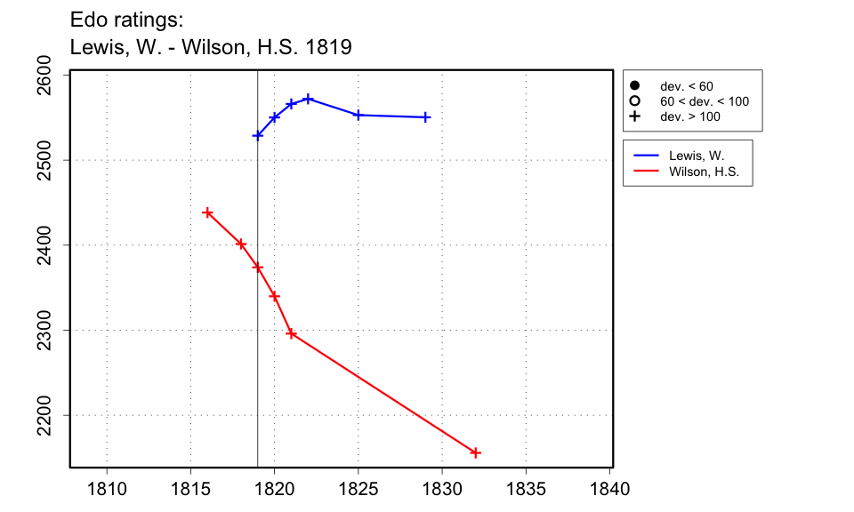 | This is a soft result. Murray only says that Lewis was playing even with Wilson in 1819. This implies that Wilson was too strong for Lewis to give him odds, so I include a soft result of a single draw to indicate this approximate equality, but without too much weight. |