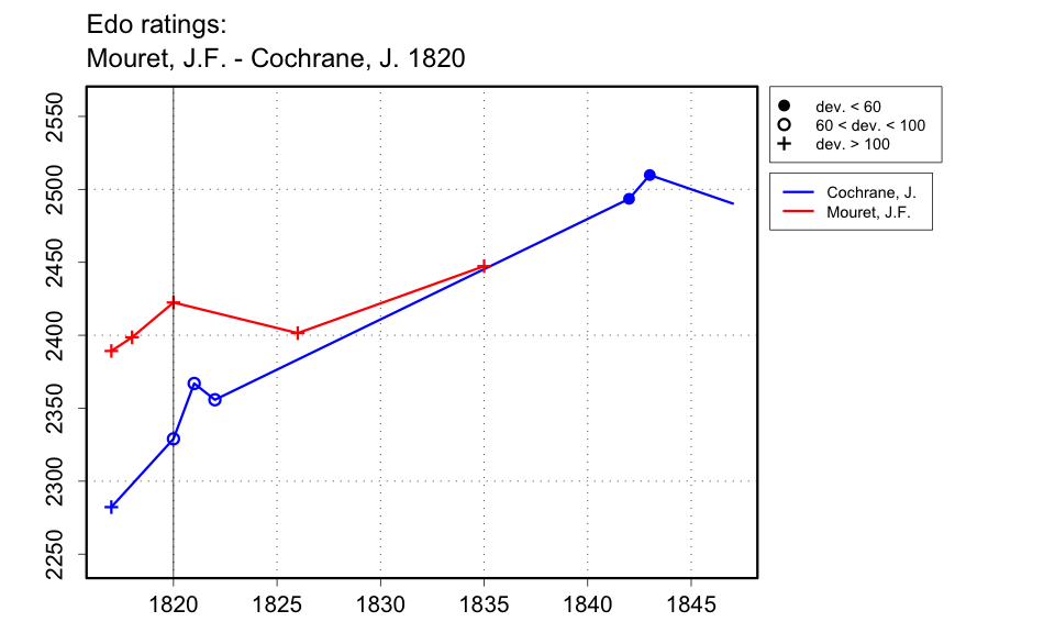 | Mouret played these games as operator of the Turk. Sarah, Spinrad and Kingston talk about this result as if it was a complete score for Cochrane against the Turk. Hunneman's book (1820) claims only that the games he published are a selection. However, it is likely that for the period in which he recorded games, he recorded all the games played by the strong players against the Turk. Thus, I am guessing that this is a complete result for the period of 1820 over which Hunneman was recording games. |