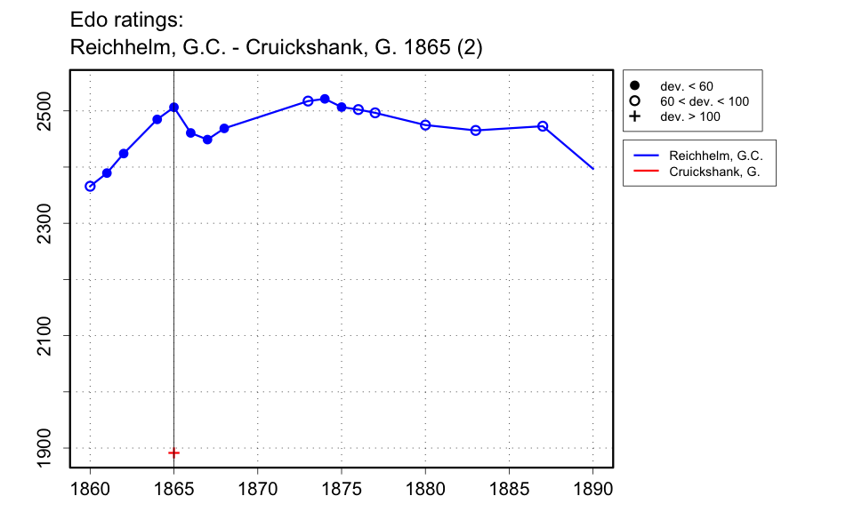 | In Chess in Philadelphia, Reichhelm says these games took place in 1866, but in the 5 Jan. 1866 issue of the Phildelphia Daily Evening Bulletin, it is stated that his visit to Harrisburg took place on the 26th of Dec., and was 'prolonged to the end of the week', which I take to be Sunday, 31 Dec. 1865. |
