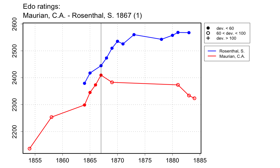 | Sarah's Morphy website gives this from an obituary of Maurian in the American Chess Bulletin of Jan. 1913 (p.11), saying that 14 games were played, Maurian winning all 7 of the games where Rosenthal gave him odds of a Knight (the even games are recorded separately here). These were played 'at the Paris congress' so presumably in June or July 1867. |