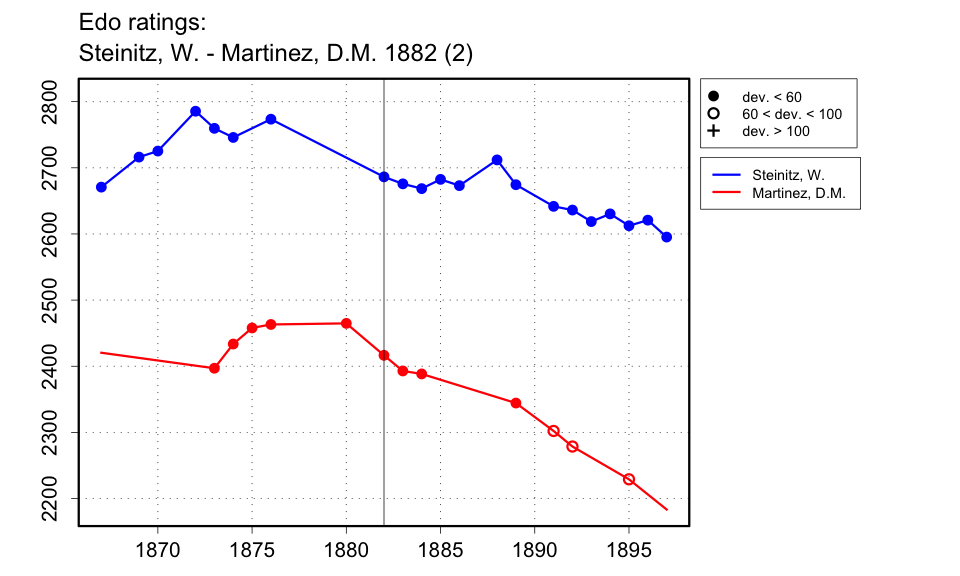| Reichhelm, Feenstra Kuiper, Di Felice and La Grande Storia degli Scacchi all give Dion M. Martinez. Kingston, in reviewing The Steinitz Papers by Landsberger, gives Aristide Martínez, but it is clear from Landsberger's book that this was the Philadelphia Martinez (Dion M.), not the New York Martinez (Aristide). Elo gives a combined result of 21.5-3.5 for Steinitz over the years 1882-1883, which matches other sources that give +7-0=0 and +3-1=3 in 1882 and +9-0=2 in 1883 for a total of 21.5-3.5. |