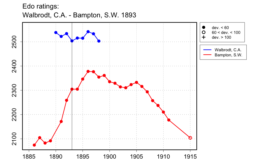 | A single offhand game was played between Walbrodt and Bampton. The date was either the very end of March or the beginning of April 1893, according to Hilbert. |
