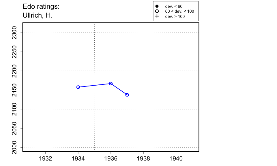 Gaige has 'Ulrich, Heinz' in Chess Personalia (p.436) and Di Felice has 'Ullrich, Heinz' at Bad Saarow 1935 and Bad Elster 1937. Feenstra Kuiper has just 'Ullrich' at both of these events. The 1935 Deutsche Schachzeitung (p.290) has 'B. Ullrich' at Bad Saarow 1935. The Bad Elster 1937 tournament book has 'Herbert Ullrich' (this information sent to me by Alan McGowan); the 1937 Deustsche Schachzeitung has 'Herbert Ulrich' on p.101, but 'H. Ullrich' on p.163 and 'Herbert Ullrich' on p.164 as Dresden champion, and the 1937 Deutsche Schachblätter has 'H. Ullrich' (p.141), 'Herbert Ullrich' (p.172), and at Bad Elster 1937, it has 'Ullrich' of Dresden (p.176). So this was Herbert Ullrich, not Heinz Ulrich, at Bad Elster 1937. |