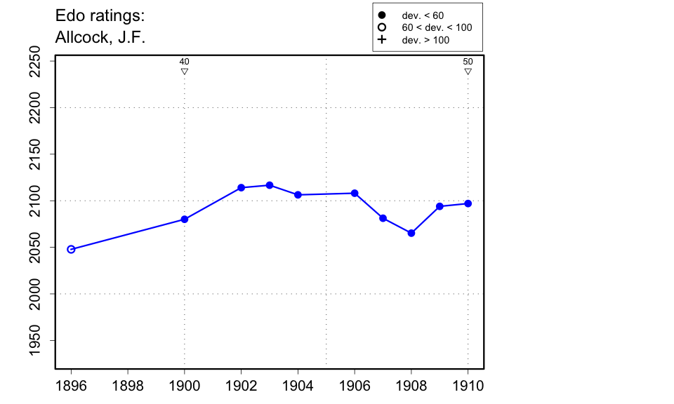 | Full name and birth and death dates from UK census data, sent to me by Gerard Killoran. The British Chess Magazine of June 1896 (p.231) and the Sunday Times of 10 May 1896 (p.8) have 'F.J. Allcock', which I guess to be an error for 'J.F. Allcock'. The Bristol Mercury of 3 Sep. 1900 (p.5) has 'G.F. Allcock' at Bath 1900, but this is clearly an error since the Birmingham Daily Post of 18 Sep. 1900 has 'J.F. Allcock' at Bath 1900. |