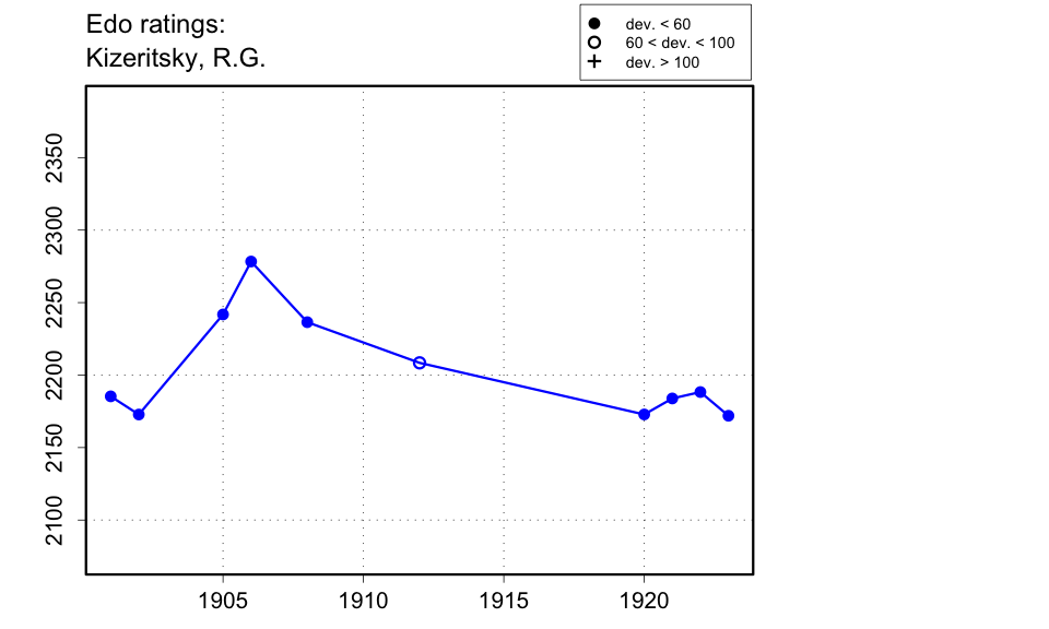 | Name given variously as 'Kieseritski', 'Kieseritzki', 'Kieseritzky', 'Kiseritski' and 'Kizeritsky'. Gaige has 'R.G. Kieseritzky' at Leningrad 1922. The tournament book of the Chigorin Memorial 1909 has 'R.K. Kieseritzky' ('Р.К. Кiезерицкiй'). The Deutsche Schachzeitung of Jan. 1902 (p.8) has 'P. Kieseritzky'. |
