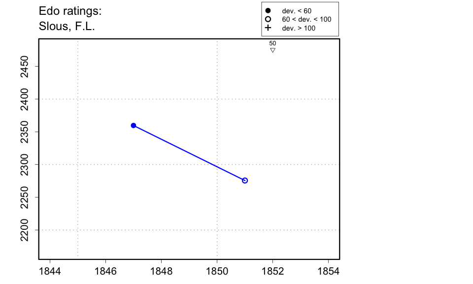 | Aside from a single offhand game with Anderssen, the only result I have for Slous is a series of games played against Harrwitz in 1847, but he had then been inactive for years, and this result probably does not reflect his strength in the 1830s. Staunton says (Chess Player's Chronicle, 1848, v.9, p.327) that Slous started poorly in this series of games against Harrwitz but gradually regained his playing strength and won more games towards the end of the series. According to Le Palamède (1844, new series v.4, p.235), Slous had then (in 1844) been in retirement for four years, for reasons of health. Murray (British Chess Magazine, May 1906, p.192) gives his year of birth as 1801; Gaige gives year of birth as 1802. The Era of 20 Jul. 1862 (p.5) has 'F.J. Slous', corrected in the 27 Jul. 1862 issue (p.5). The British Chess Magazine of Sept. 1892 (p.395) has 'Frederick Loke Slous'. |