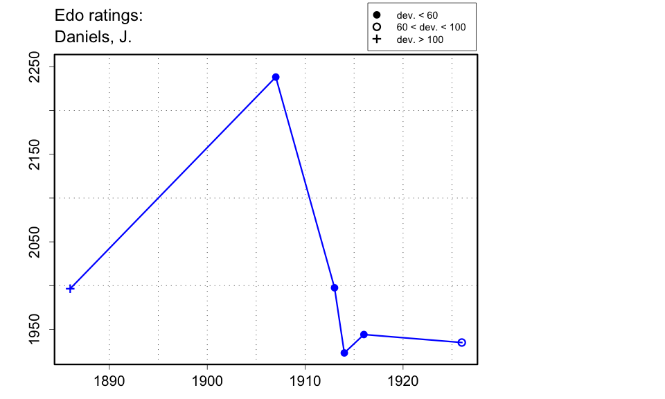| Di Felice has 'Daniels, Jacques' at Excelsior 1907, Chicago 1913, Chicago 1916, and Chicago 1926; chessgames.com has 'Joseph Daniels' at all these events as well as Memphis 1914. I am guessing that the J. Daniels of Cincinnati, active in 1886 and 1888 was the same player. |