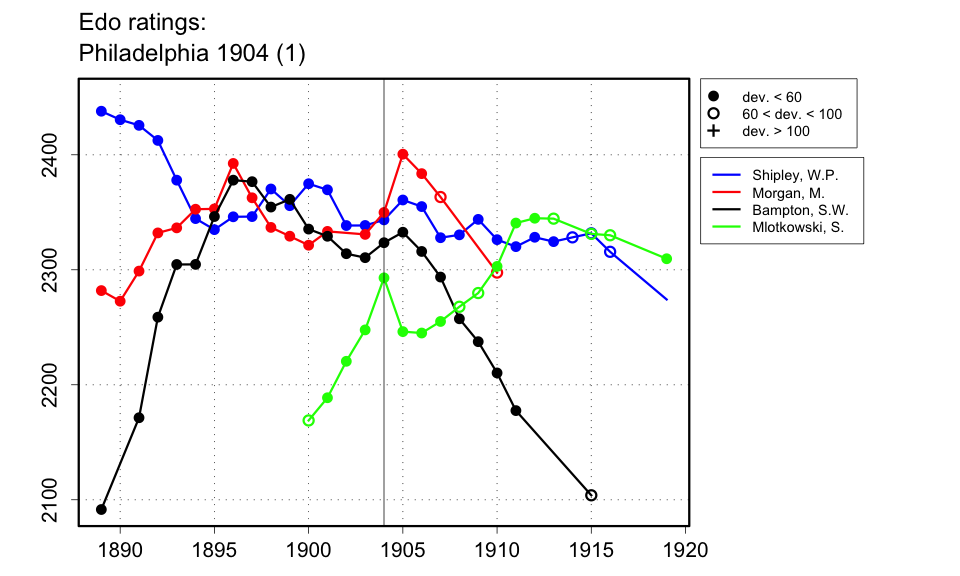 | This was a 14-player single-round all-play-all tournament, but W.F. Reed withdrew before completing his games. Shipley had already beaten him, but as it is not clear who played Reed and who did not, I do not count this win in Shipley's score here. After Reed's scores were discounted, Shipley ended up in a 3-way tie for first with Bampton and Mlotkowski. The Los Angeles Herald of 10 Jun. 1906 (p.41) also gives the score of Morgan. The Los Angeles Herald says 'in the play off of two games each, Bampton and Shipley drew their games with Mlotkowski, while Bampton, by drawing his first game and winning the second from Shipley, obtained first place. Hilbert gives a draw by Shipley against each of Bampton and Mlotkowski in the play-off, and says the Bampton eventually won, which is all consistent with the Los Angeles Herald report. |