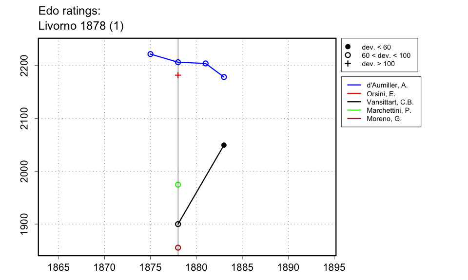 | 16-player, knockout handicap tournament, with players in 4 classes, with one game per pairing, except that draws were to be replayed. The tournament book says that Orsini and d'Aumiller played two draws before Orsini won. No mention is made of other draws, but there may have been some. The tournament book says that all of these matches were completed in four days, so I am guessing that they started on 31 Aug. and finished on 3. Sep. 1878. |