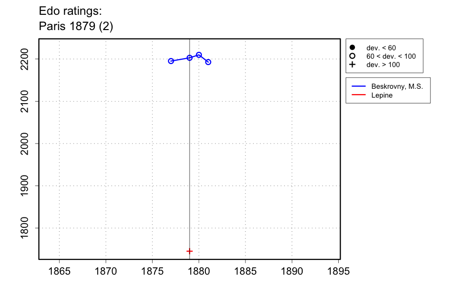 | Partial results available. 17-player, double-round all-play-all, in which every game had to be an Evans Gambit. Class 1 players (just de Beskrovny) gave an 8 point advantage to the rest (class 3) and class 2 players (Gribius, Najotte, Numa Preti) gave a 6 point advantage to the rest. Thus, Lepine won the tournament with 24 out of 32, de Beskrovny was 2nd, with 30.5 out of 32, since Lepine's score with the 8 handicap points was 32. Dates unclear, but Cornil's extracts from La Stratégie indicate that it did not start until at least April 1879, and was set to end by May 31, but may have extended into June or July as the July issue of La Stratégie says that it is finished at last ('enfin terminé'). |