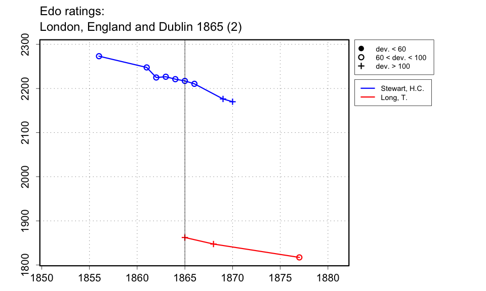 | This was an 8-a-side team match, but only two games were completed by the end of the evening. The other games were not adjudicated. An attempt to assess them after the fact was made by the Dublin club, but the results were not accepted by Löwenthal in the Era of 24 Dec. 1865 (p.4) or in the Chess Player's Magazine of Mar. 1866 (pp.67-68). |