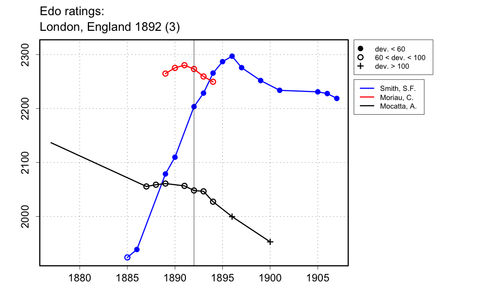 | Play-off between the winners of the 3 first-class sections, Moriau, Mocatta and Smith. According to the 6 Feb. 1892 issue of the Evening News and Post (p.4), the first game, a win by Smith over Mocatta, was played on 3 Feb. 1892. Then Mocatta lost to Moriau, according to the British Chess Magazine of Mar. 1892 (p.106), and then Moriau and Smith played a draw before Moriau won the final game on 17 Feb. 1892. |