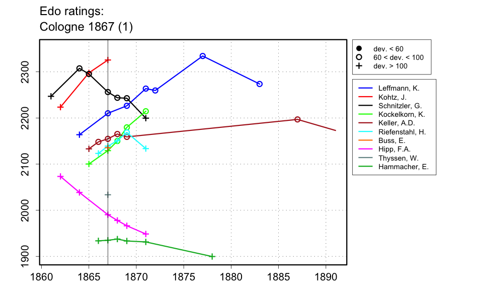 | Only partial results available. This was a 16-player knockout tournament. The Schachzeitung of 1 Sep. 1867 (cover) gives the names of all 16 participants. The 15 Sep. 1867 Schachzeitung (p.293) gives the names of the 8 first-round winners, the 4 second-round winners, and the 2 third-round winners, without specifying who beat who. It does mention that in the first round Riefenstahl won over Thyssen by lot, after several drawn games were played. I will guess at 3 draws, though the exact number is not stated. The Dec. 1867 Schachzeitung (pp.376-379) gives 7 of the games from this tournament, which enables one to reconstruct some of the pairings and the likely winners of those pairings. It seems likely that there was only one game per pairing, but if there were more, there is a possibility, despite a won game being given, that the loser of that game eventually won a best-of-three competition to advance. This seems unlikely however, and I will assume that the winner of a won game actually won the pairing. Thus, aside from the Riefenstahl-Thyssen result, we have first round wins by Kohtz over Schnitzler, Leffmann over Kockelkorn and Buss over Hammacher (both Eduard and Emil Hammacher were in this tournament and lost in the first round, so I am only guessing that it was Eduard Hammacher who lost to Buss here). In addition to Riefenstahl, Kohtz, Leffmann and Buss, the other first round winners were C. Höing, Schuster, A. Keller, and F.A. Hipp. Aside from Thyssen, Schnitzler, Kockelkorn and Eduard and Emil Hammacher, the other players who lost in the first round were R. Lichtenscheidt, Alfred Schlieper, and E. Neuhaus. In the second round, we have a win by Riefenstahl over Hipp. The other winners were Buss, Keller, and Kohtz, and the other losers were Höing, Schuster, and Leffmann. In the third round we have wins by Kohtz over Keller and by Buss over Riefenstahl. And in the final, we have a win by Kohtz over Buss, and we have the statement in the Crefeld 1871 tournament book that Kohtz won here in the end. Also, Riefenstahl gave up 3rd prize to Keller without playing for it. |