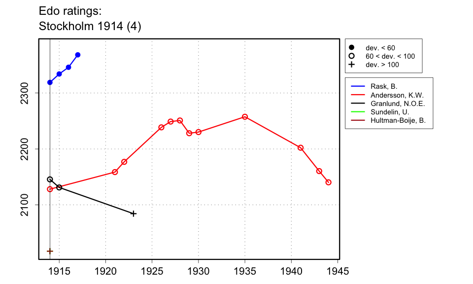| Svenska Dagbladet (4 Jun. 1914, p.10) gives only the scores of the top 5, without saying how many players there were. The scores are consistent with a 9-player single-round all-play-all tournament, where the other 5 players would have averaged 2.625 points, and the Nov. 1913 issue of Tidskrift För Schack (p.200) lists 9 players as signed up to participate. The other 4 were G. Branting, Ä. Noreen, G. Nyberg, and S. Kinnman. |