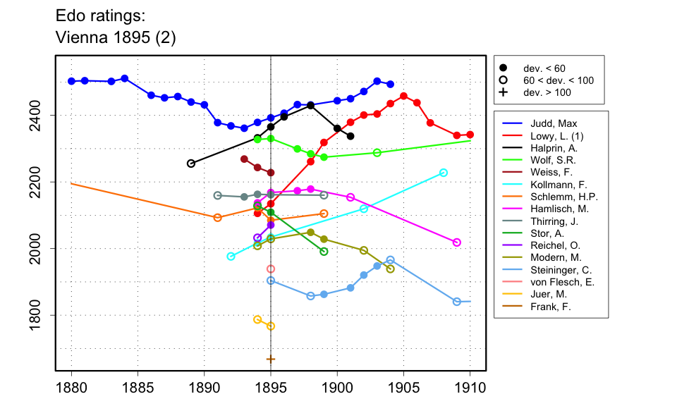 | The results are reported in the 16 Jun. 1895 issue of the Allgemeiner Sport-Zeitung (p.617) and the intended end date was the end of Apr. 1895, so I will guess that it actually ended in May 1895. The play-off for fifth prize was won by Weiss over Thirring, but how many games were played is not indicated. I assume 1-0 for Weiss. |